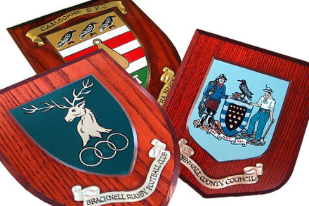 Crafted by hand, our plaques feature your logo or Coat-of-Arms (Heraldic Shield), which is hand painted in enamel onto an embossed centre and then mounted on a solid hardwood base. Extra scrolls can be used to highlight special anniversaries or events, engraved brass plates are available too.